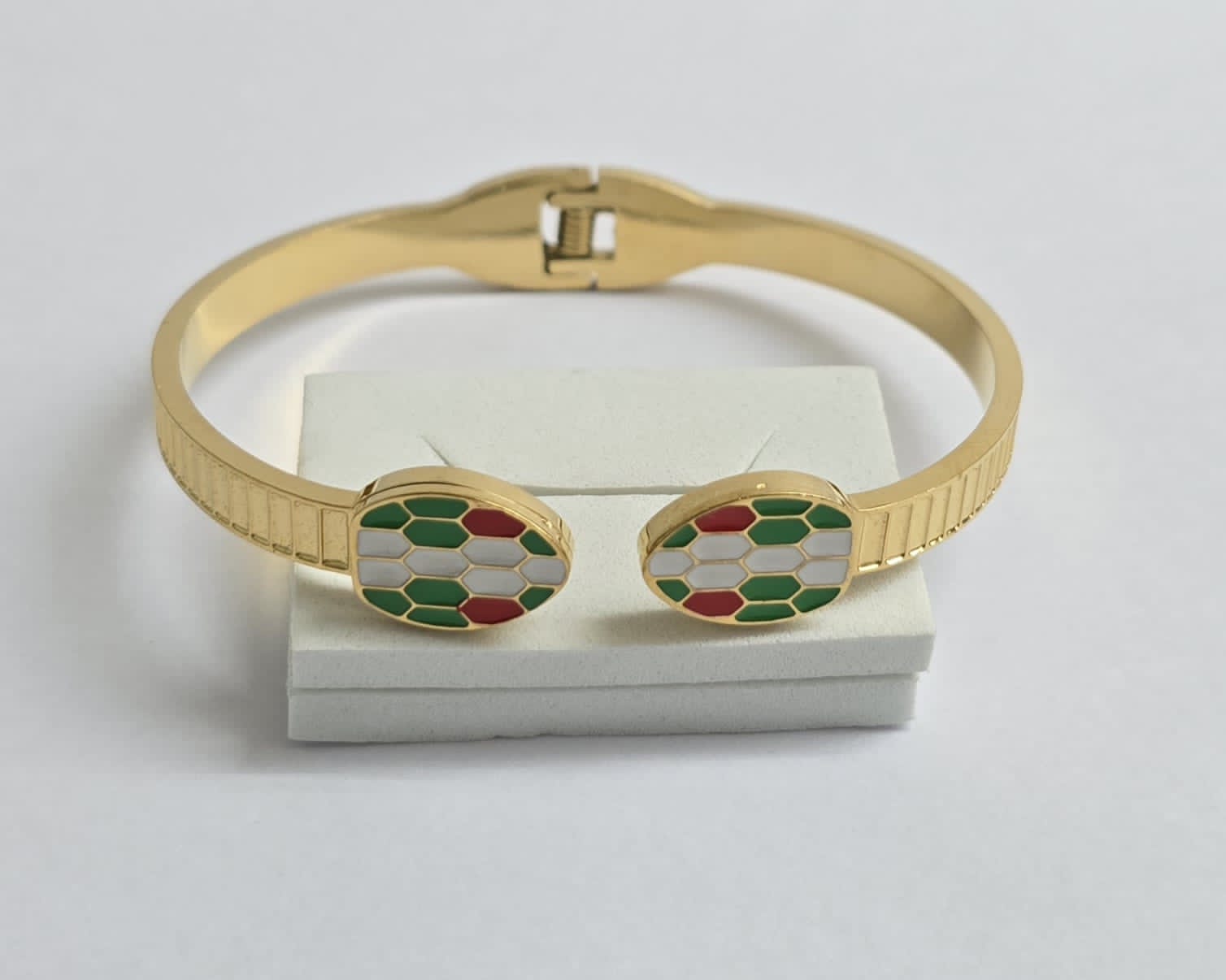 Infuse your style with vibrant charm. This gold-tone bangle features twin oval accents adorned with a geometric honeycomb pattern in green, red, and white enamel. The structured band adds a modern, textured finish, making it a standout piece whether worn solo or stacked. A playful yet elegant accessory that brings color and character to any outfit.