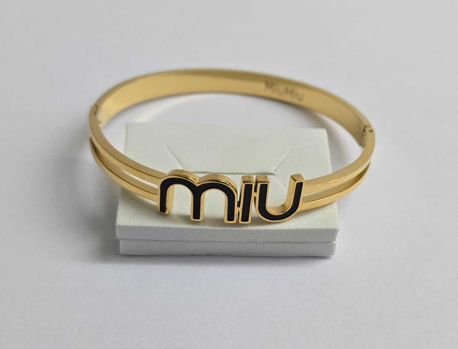 he bracelet features a sleek, minimalist bangle design. The word "miu" is prominently displayed in a modern, bold font, adding a unique and eye-catching element to the overall aesthetic.